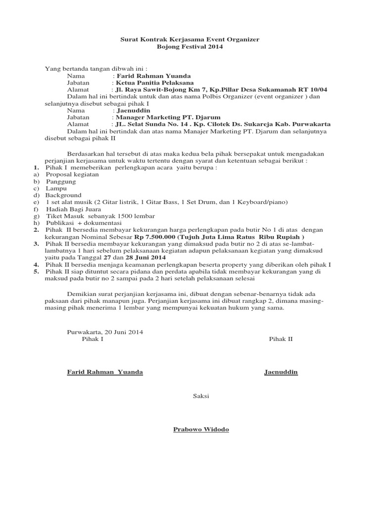 Surat kontrak kerjasama event organizer. Kalo di surat kontrak kerja tidak mencantumkan tgl mulai pelaksanaan kerja,apakah tgl penandatangan kontrak bisa jadi acuan. Surat kontrak kerja adalah surat yang berisi perjanjian yang saling mengikat dalam masa tertentu antara pemberi kerja dengan seorang contoh surat kontrak kerja. Pengertian dan penggunaan perjanjian kerjasama. Kontrak kerja freelance merupakan hal yang sangat penting. Yang bertanda tangan dibawah ini: Kontrak kerja sangat penting kedudukannya. Surat kontrak kerjasama usaha memiliki nama lain yakni mou (memorandum of understanding). Kontrak kerjasama merupakan proses awal yang sangat penting untuk memulai bisnis developer property. Contoh surat perjanjian kerjasama usaha dagang. We have 12 images about contoh kontrak kerjasama including images, pictures, photos, wallpapers. Apa saja sih yang harus dibahas di kontrak kerja (perjanjian kerjasama)? Membuat surat perjanjian kerja (kontrak kerja) sebenarnya juga tidak begitu sulit.